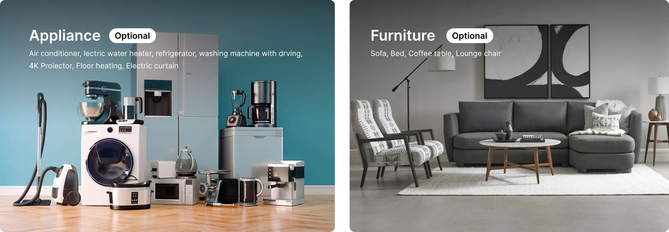 Optional configuration: sofa, coffee table, TV cabinet, double bed, bedside table, refrigerator, TV, kitchen (lower and upper cabinets, sink, artificial stone countertop), hob.